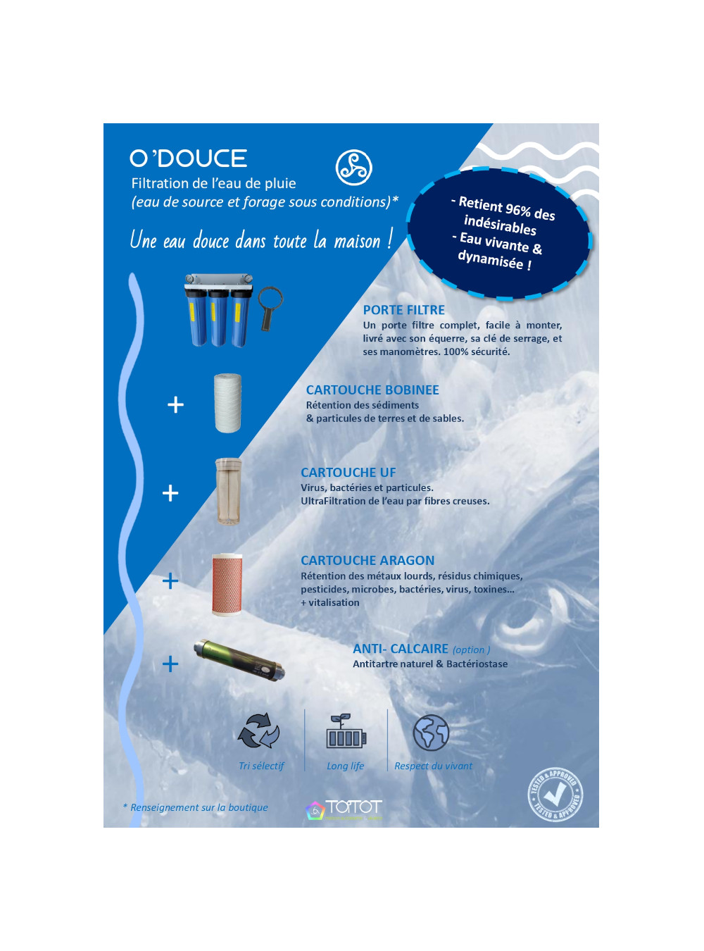 Filtration de l’eau de pluie, et la plupart des eaux de puits, de forage et de source, le tout avec anti-calcaire naturel. Le set O’Douce fonctionne par filtration naturelle, respecte l’eau et le Vivant. Rétention de tous les résidus, microbes et chimie indésirables contenus dans toutes les eaux de pluie, de puits, de source et de forage.